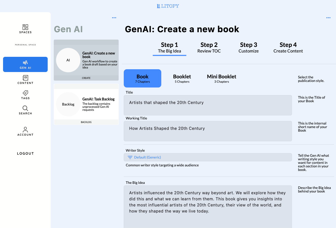 Tell Litopy your big idea and let the AI writing assistant go to work. Choose from different book sizes and let AI create a draft table of contents that you can modify. Then let AI write draft chapters for you - from mini booklets to full featured books with 200+ pages.
