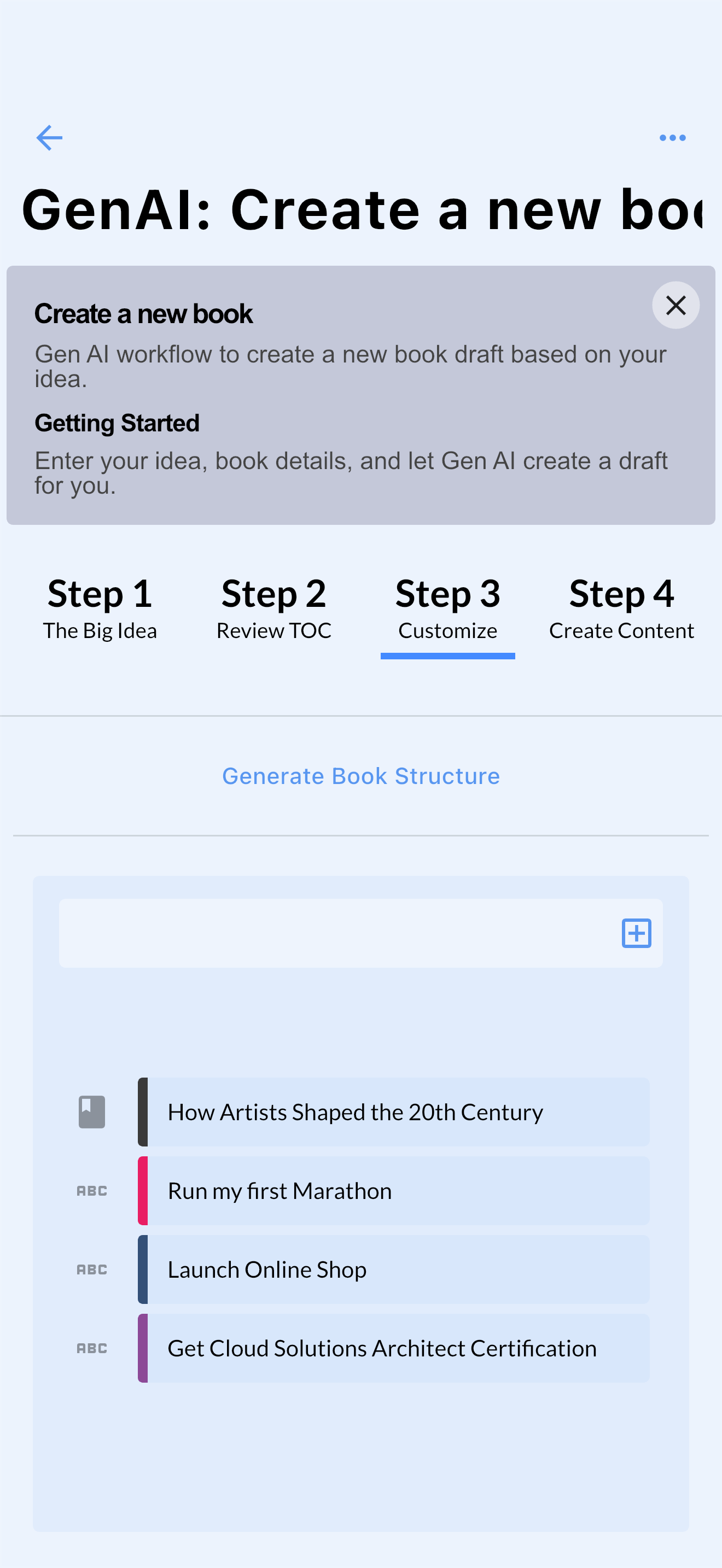 Learn MoreWe built intentional review steps into the creation process. Review and refine the table of contents until you love the outline. Generate sample sections to refine instructions for writing style and target audience. Create cover images based on your instructions and auto-generate marketing language to make listing your book in online stores quick and easy.