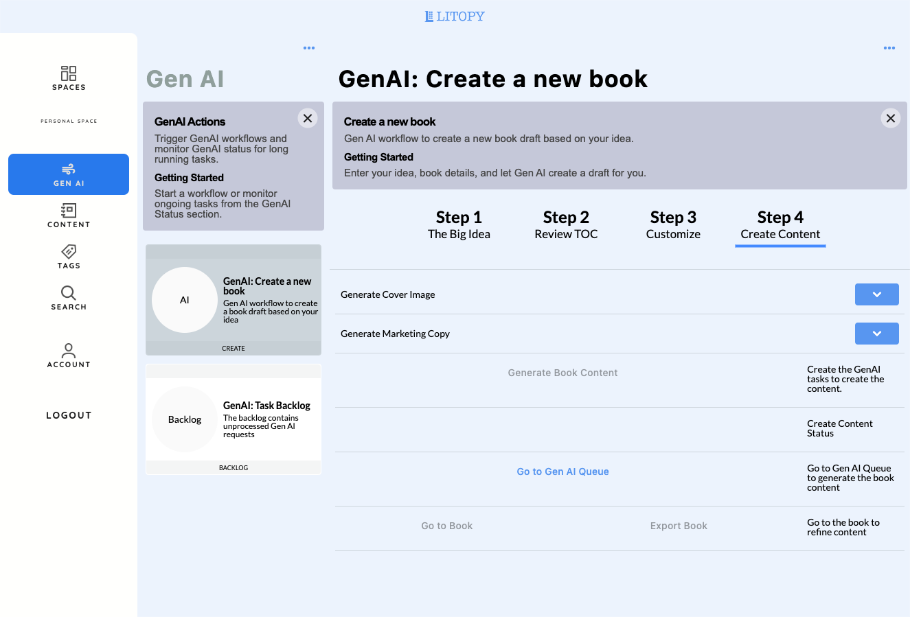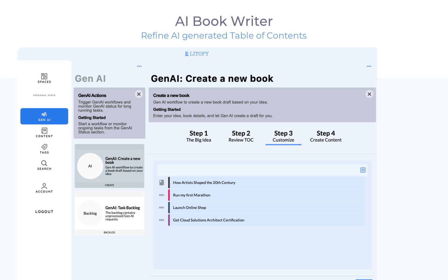 Learn MoreKickstart your writing by telling Litopy about your big idea to get a first draft of a table of contents for your book within minutes.