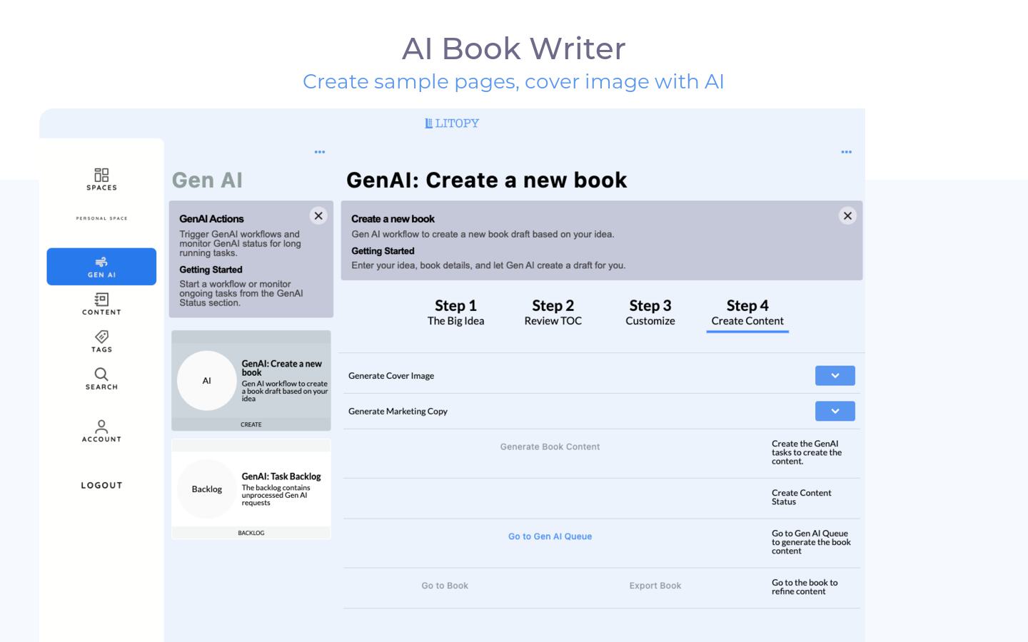 Tell Litopy your big idea and let the AI writing assistant go to work. Choose from different book sizes and let AI create a draft table of contents that you can modify. Then let AI write draft chapters for you - from mini booklets to full featured books with 200+ pages.