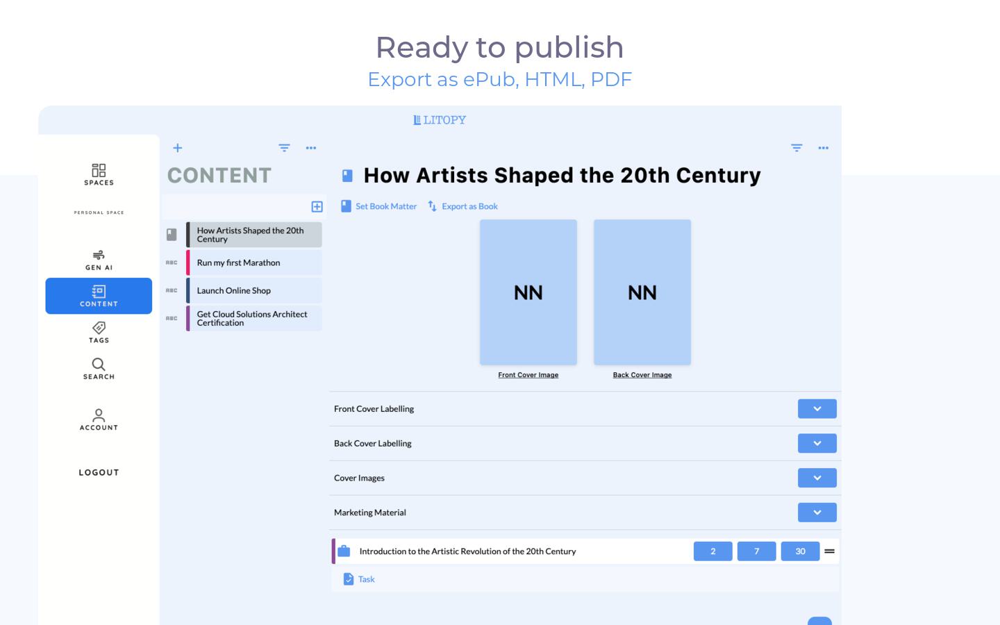 Self publish in no time with exports for ePub (compatible with Apple Books and Kindle Publishing formats), PDF, and HTML. Litopy's AI assitant can even create book cover images in the right formats for you.