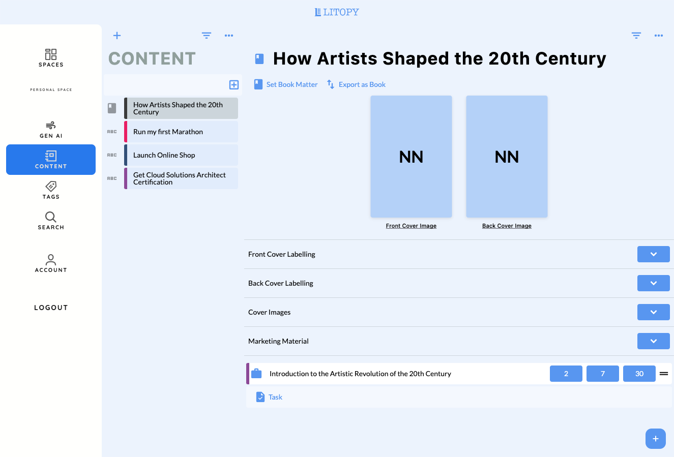 Learn MoreYou can export the created content as ePub, PDF, or HTML. The export is optimized to work directly with Apple Books and Kindle Publishing - no manual updates necessary. Just upload the exported ePub to your Author account and you are ready to release. Litopy even generates the cover images in the specific formats supported by each platform and creates marketing language for your book.
